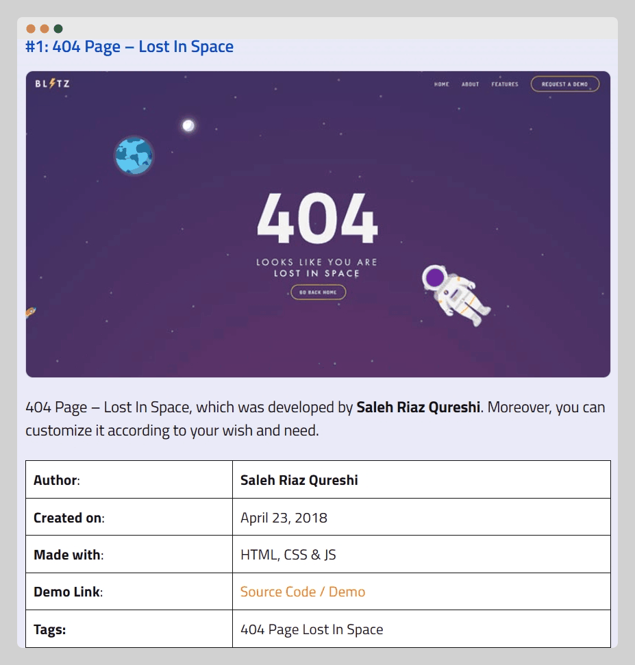 上半部分是模板的使用方法,下半部分是具体的模板展示。每个模板下面都有这个模板的简介:作者、创建时间、使用的方法(提供你35+的404页面HTML模板)、源码或者demo。可以跳转详细的代码页面。调整上面的代码还会刷新同步改变下面页面展示的效果。