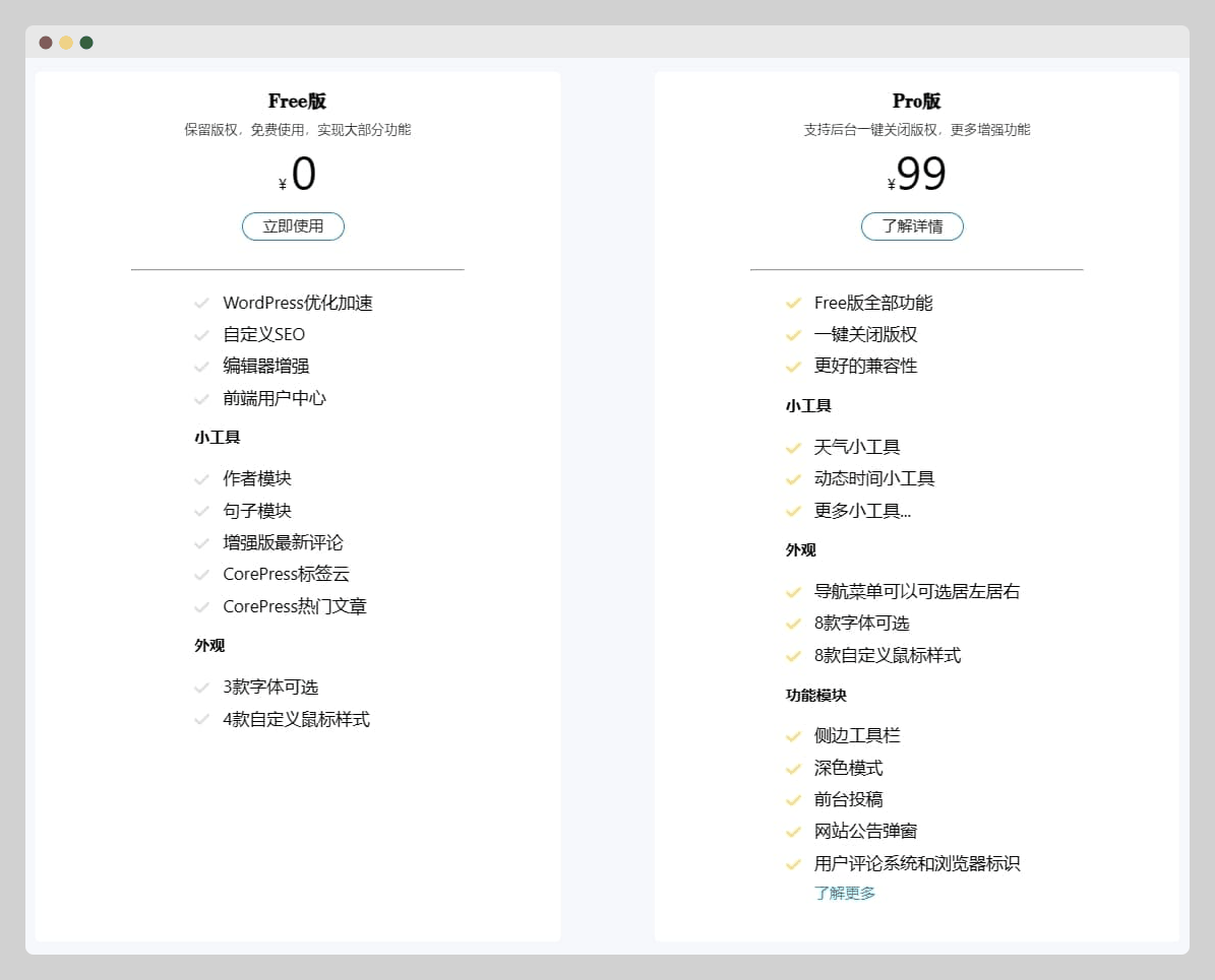 CorePress主题有官网,有团队一直在更新维护,分为免费版和专业版。收费版多了一些小工具,外观的配置和一些功能模块。如果要求不多的话免费版完全够用,个性化需求多一些的话或者想支持开发团队的话收费版更适合你。
