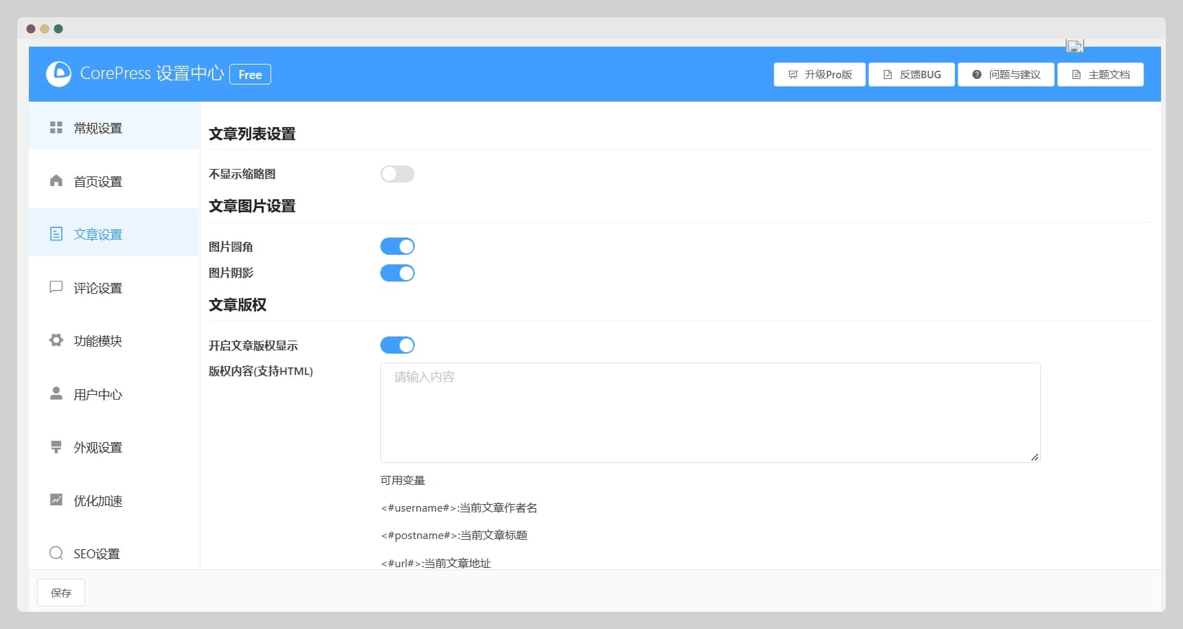 - Free版本免费使用,并长期维护,不过需要保留底部CorePress标识版权
