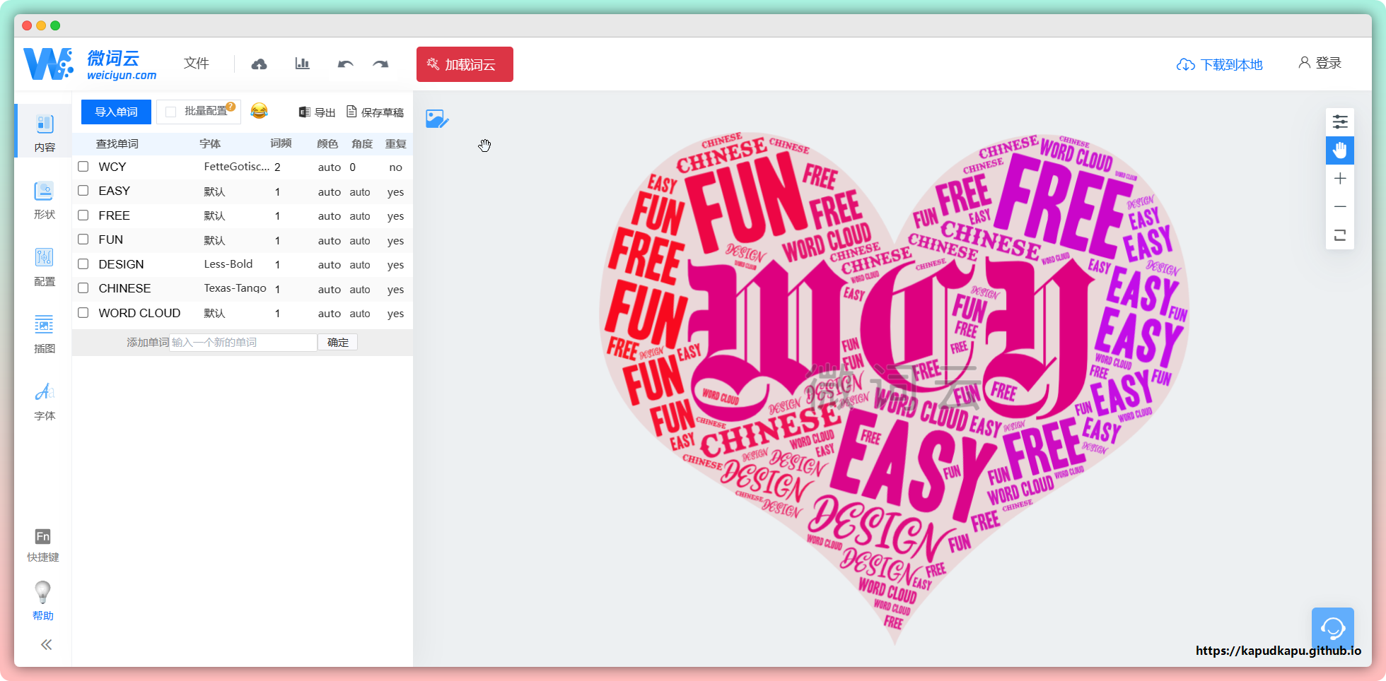 微词云是一款实用性强、简单的在线文字云、在线词云图生成器。支持单词导入,支持设置字体、词频、颜色、是否重复、角度,也支持单个单词单独设置。导出需要登录。