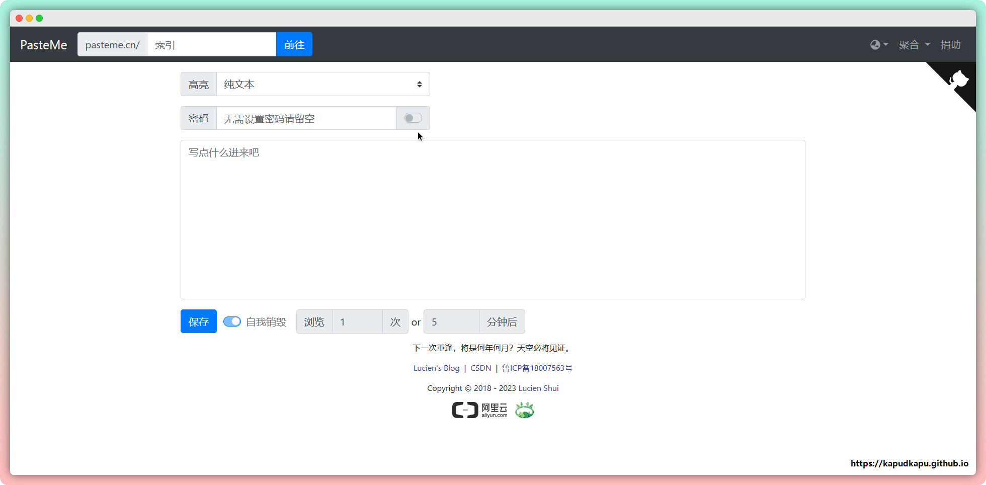 PasteMe 是一个无需注册的文本分享平台,针对代码提供了额外的高亮功能。支持纯文本、Python、MarkDown、JSON等,支持设置阅后即焚或者几分钟后销毁,支持设置密码。