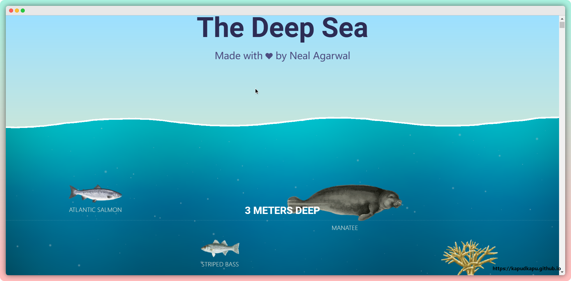 一个简单的网站,整个网站是一个海洋,往下滑动相当于深海下潜,在每个深度展示对应深度存在的物种。