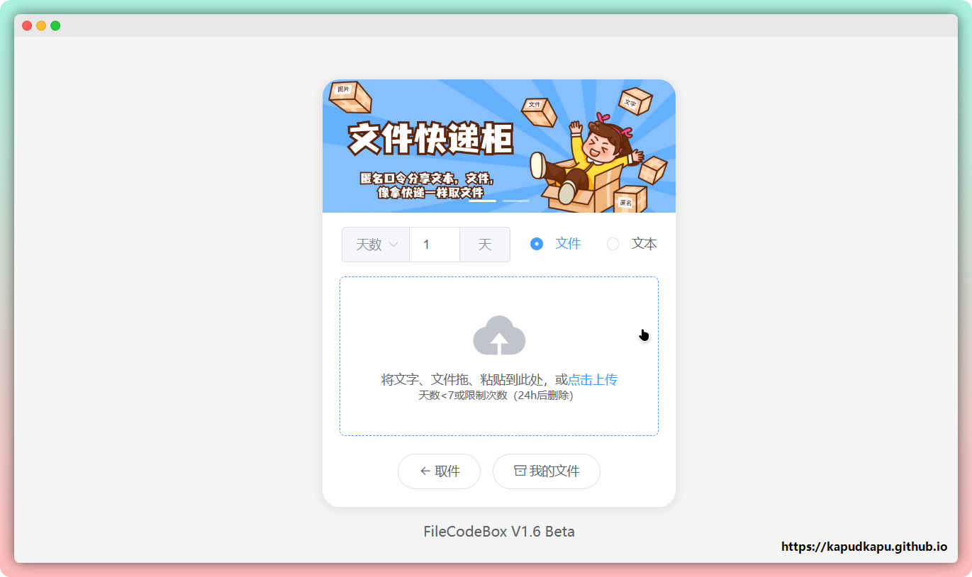 像取快递一样传输文件。支持文件和文本,支持设置下载次数或者分享天数。