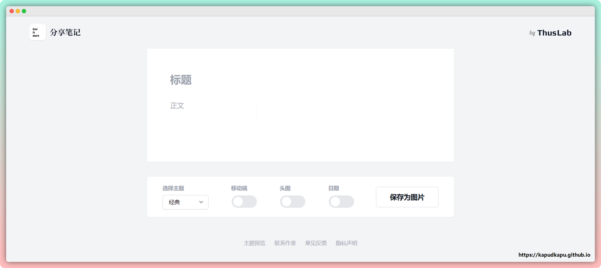 一个简单好用的文字分享工具,将文本内容保存为图片分享。有标题和内容区分,支持选择主题、是否移动端、是否添加头图,是否显示日期。
