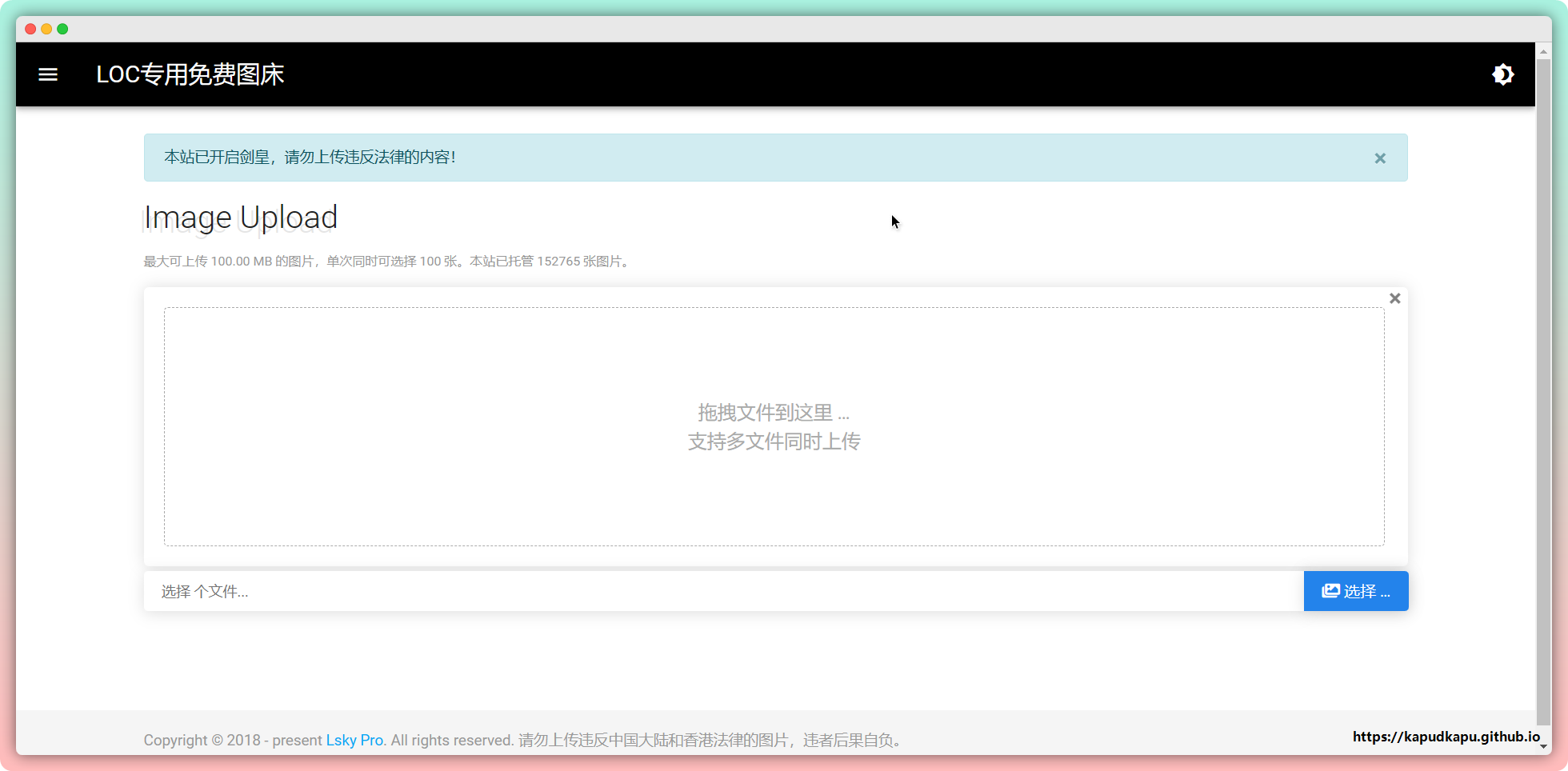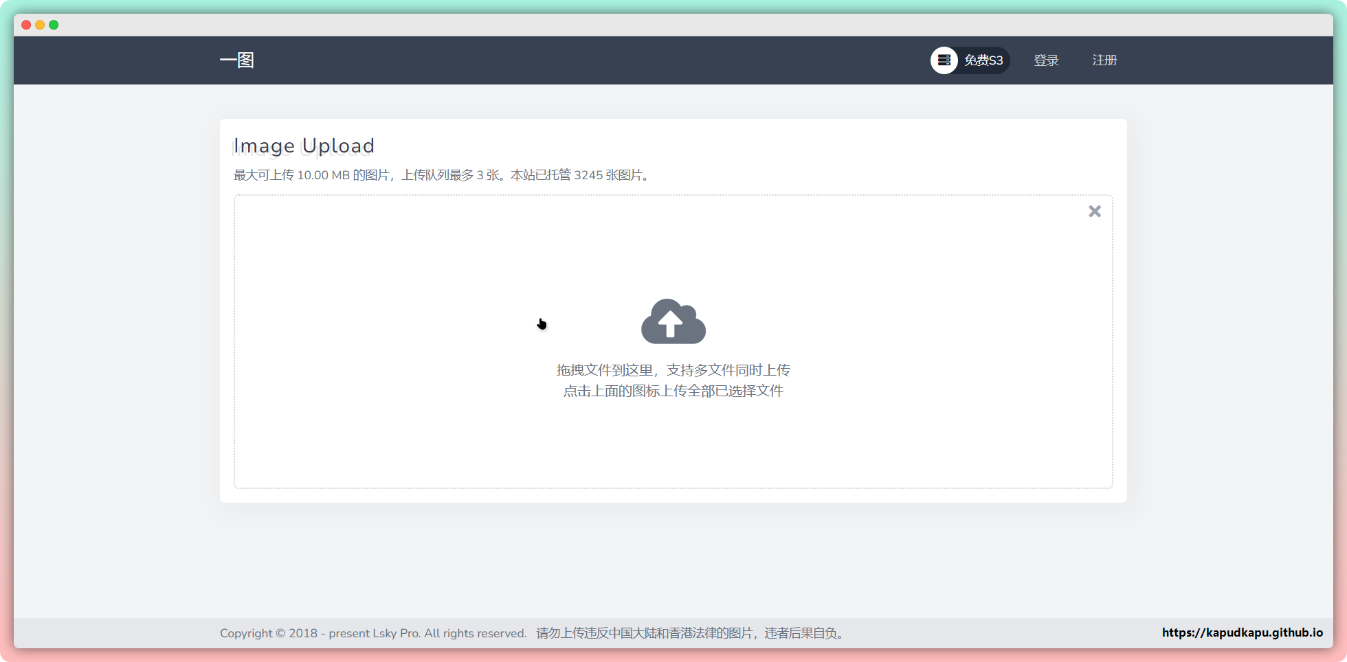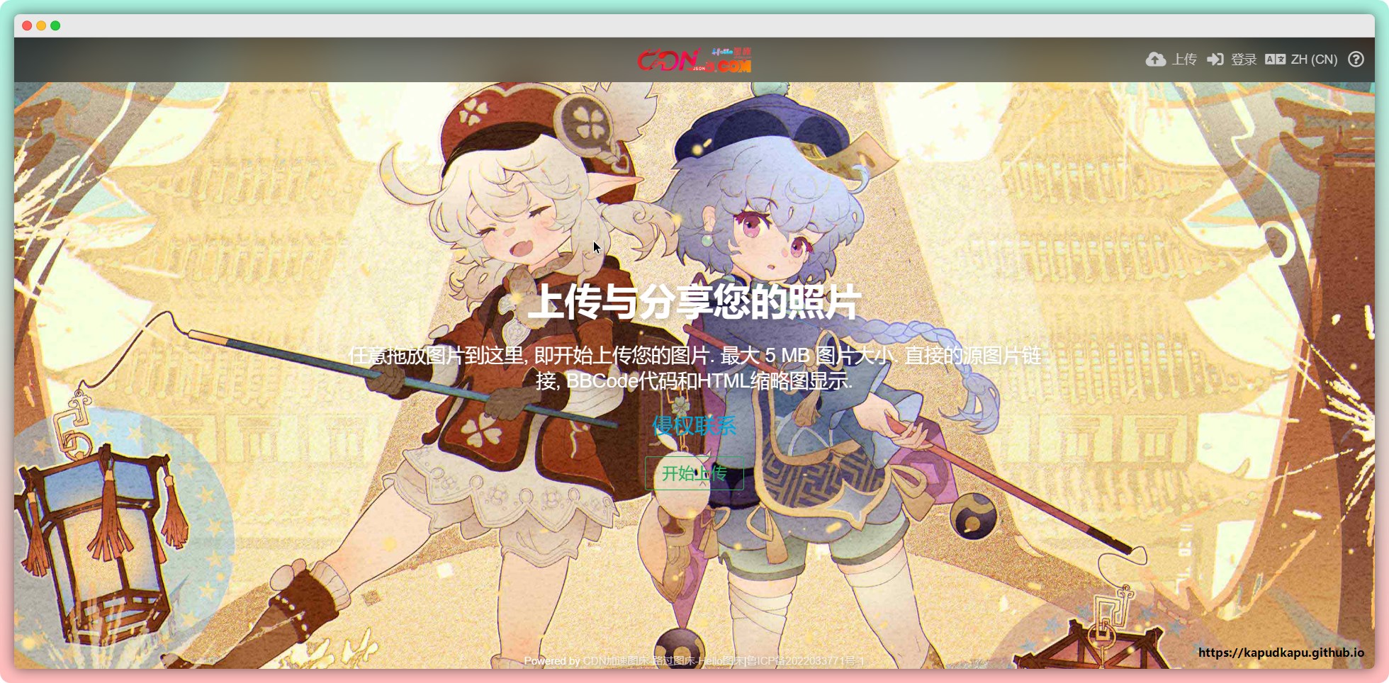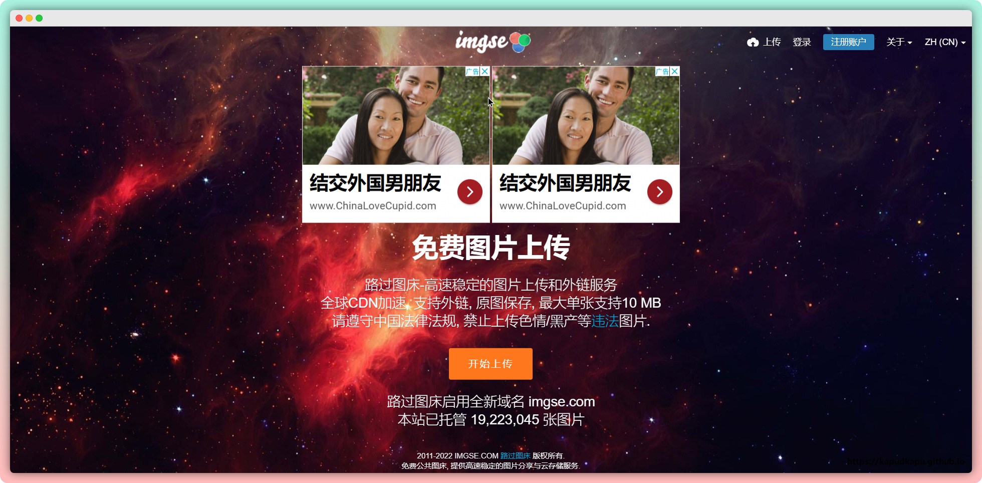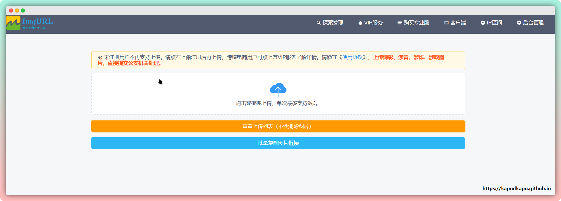 非注册用户最大5M,注册用户支持单张最大10MB图片上传,没发现单次上传数量限制。整体页面和ImgURL相差无几。