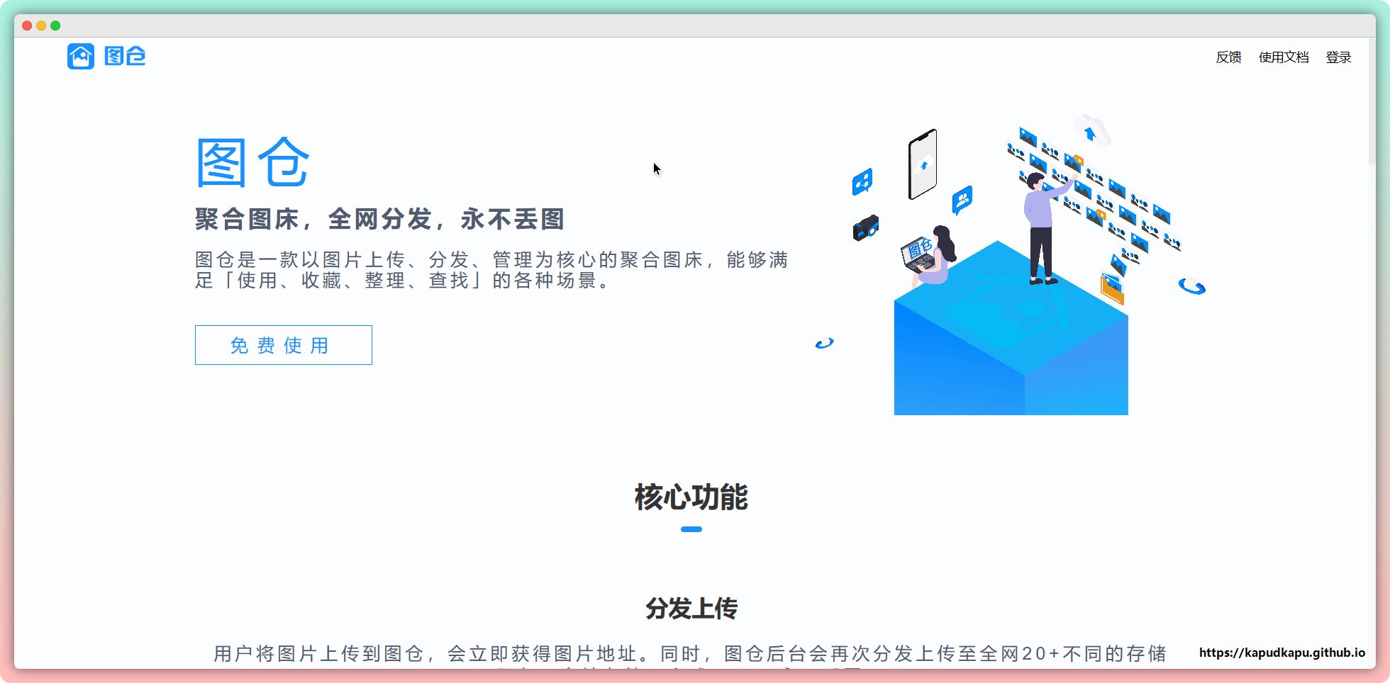 图仓是一款以图片上传、分发、管理为核心的聚合图床,能够满足「使用、收藏、整理、查找」的各种场景。