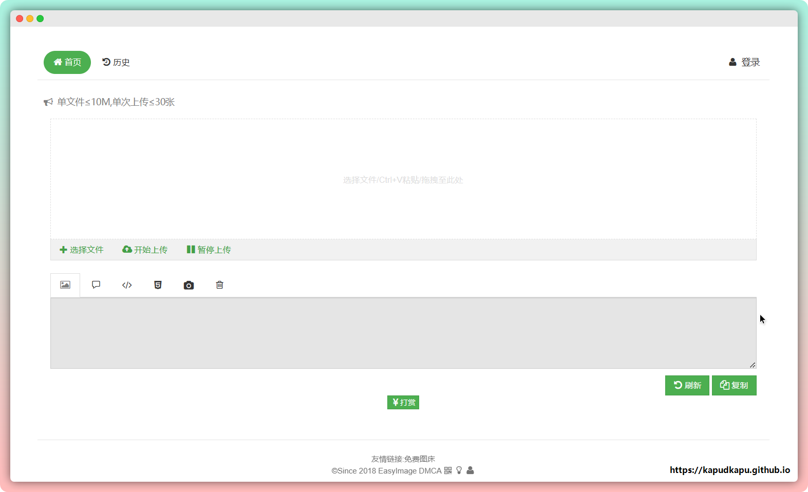 免登录上传,直至注册登录,单文件≤10M,单次上传≤30张,直链。