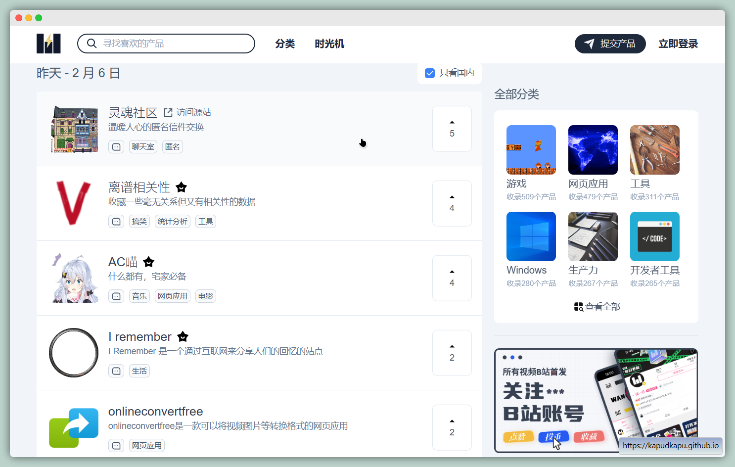 B站UP一网一匠创建的产品发现社区,旨在打造一个服务于产品创造者和爱好者分享和交流社区,没事儿可以来里面寻找一些有趣的产品和网站。