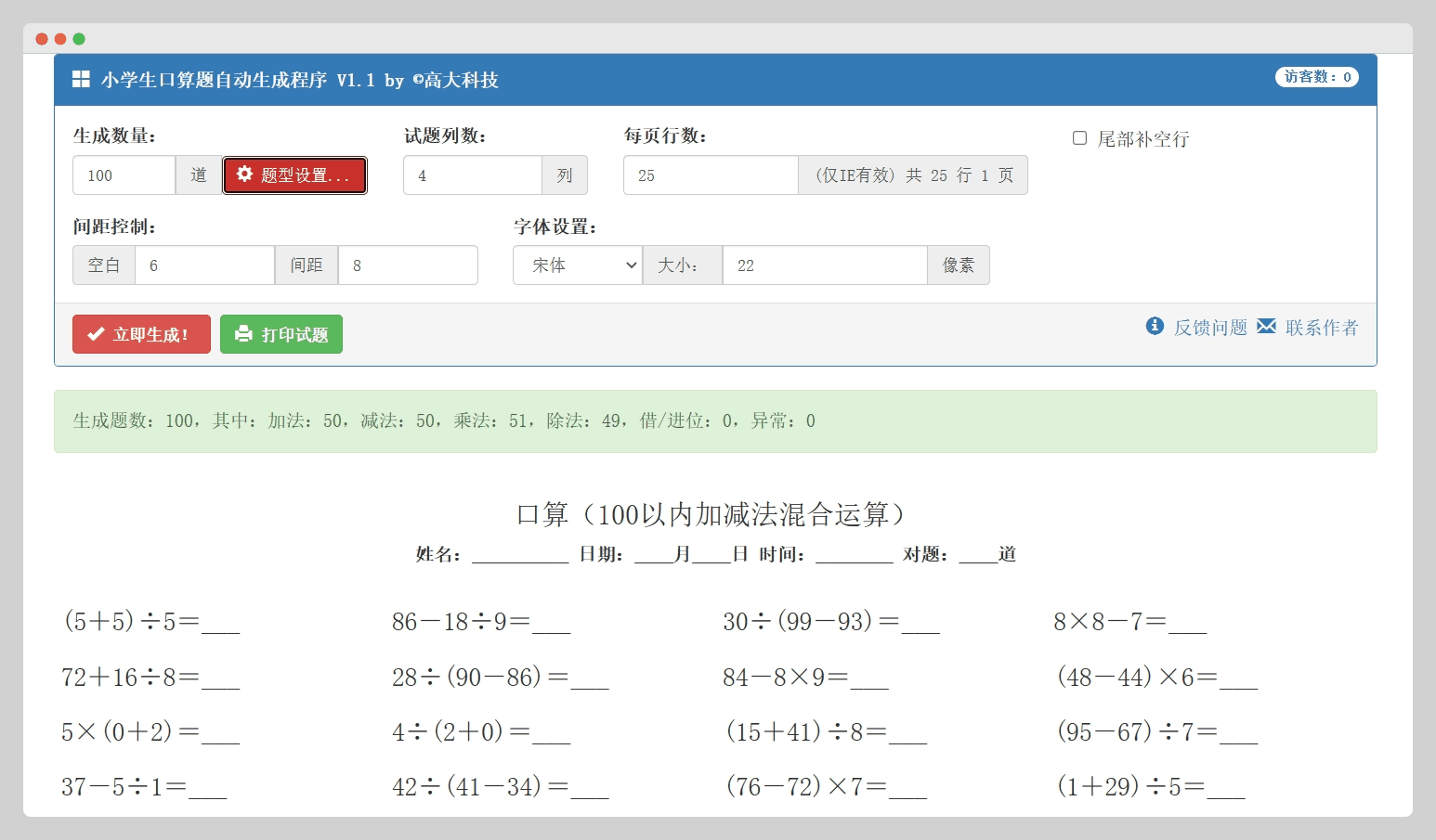生成指定题型,指定数量的小学生口算题,支持打印。