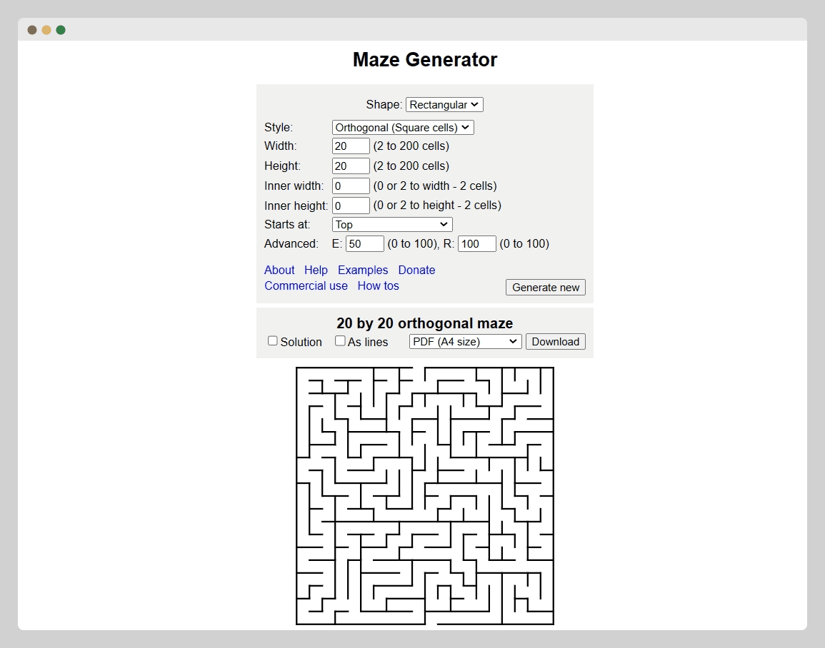 可以设置长款、迷宫是正方形、三角形还是六边形;可以下载pdf、svg、png。