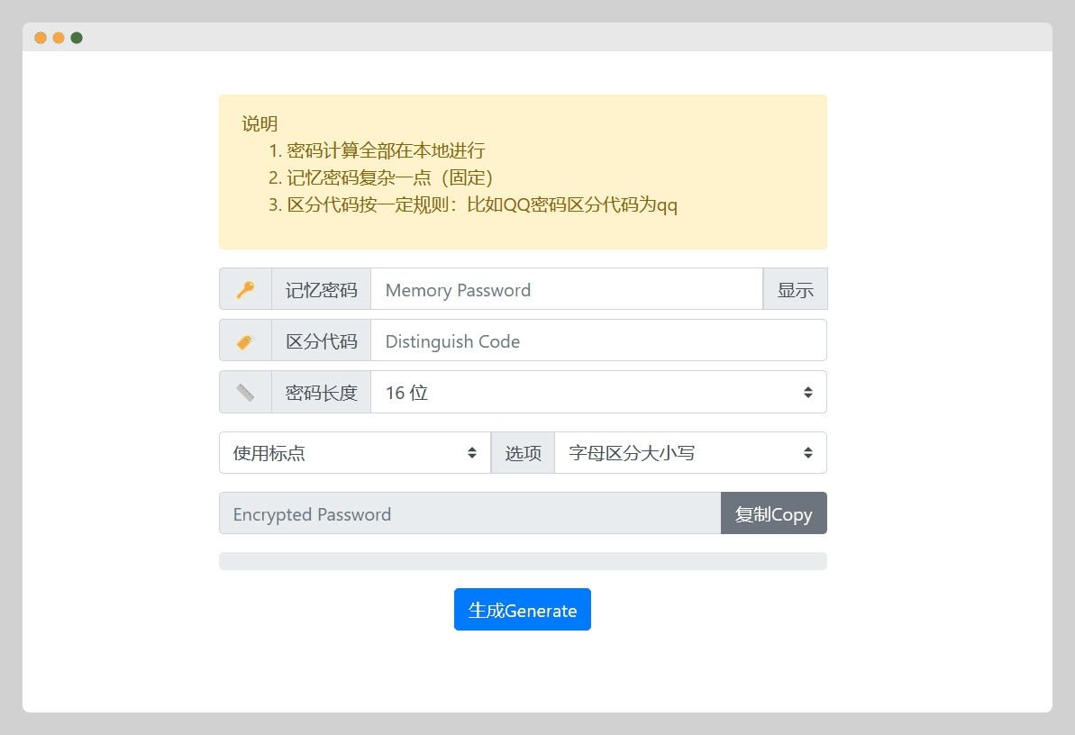 通过一个记忆密码和不同的区分密码来生成高强度的密码,可选字符、字母、大小写。