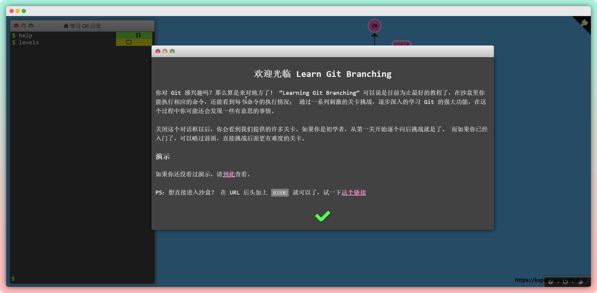你对 Git 感兴趣吗?那么算是来对地方了! “Learning Git Branching” 可以说是目前为止最好的教程了,在沙盒里你能执行相应的命令,还能看到每个命令的执行情况; 通过一系列刺激的关卡挑战,逐步深入的学习 Git 的强大功能,在这个过程中你可能还会发现一些有意思的事情。