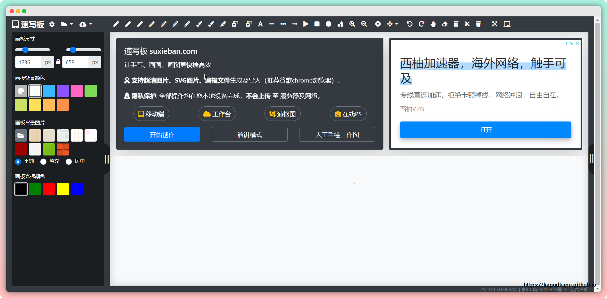 速写板是一款在线画画网站及画图工具,支持画画、画图、画思维导图、流程图、草图、图片生成、素材导入、SVG导出等功能,支持图片制作、SVG制作等。用户可通过画笔、喷漆、插入文字、图形库、素材库及功能菜单快捷高效的画画、画图、制作并分享精美的图片等。