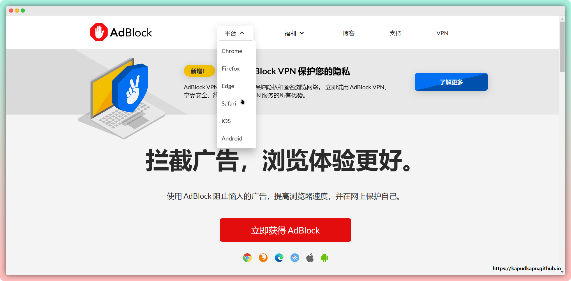 知道AdBlock但是还是第一次见它的官网,可以直接跳转对应的浏览器扩展页面及下载对应版本的AdBlock。