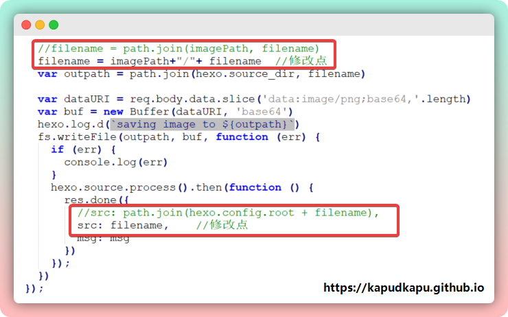 打开博客的目录的node_modules-->hexo-admin子目录,找到api.js打开,搜索imagePath找到如下位置按照修改点进行修改即可。这样以后图片复制后就可以直接展示了。
