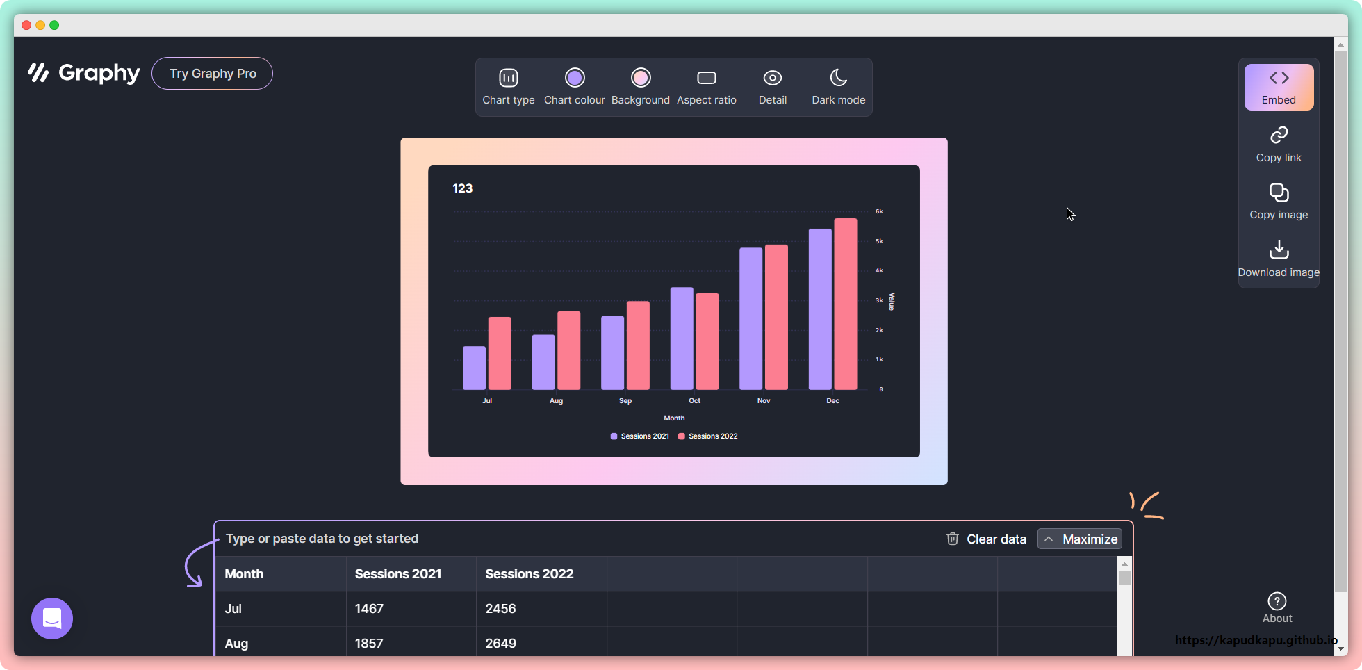 一个免费提供图表生成的站点,支持柱状图、折线图、饼状图等,支持修改背景色,图标颜色等,图片免登陆下载。