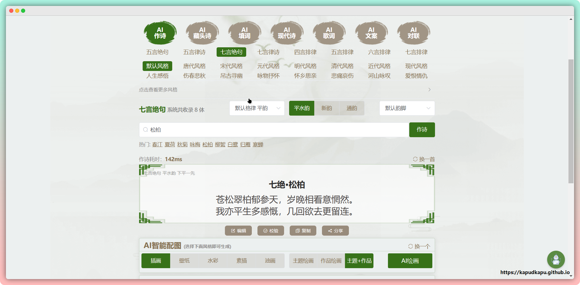人工智能在线诗歌写作平台,AI在线作诗机。五言七言、唐宋元明清风格、藏头诗等等等随意创作。
