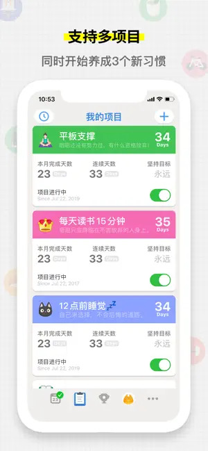 - 每日提醒:早上和晚上提醒你要坚持的习惯,绝不忘记;