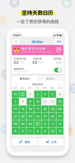 - 丰富的统计功能,可查看本月完成天数、连续天数,还有每月统计,每年统计,左右滑动可以看到具体的日期;