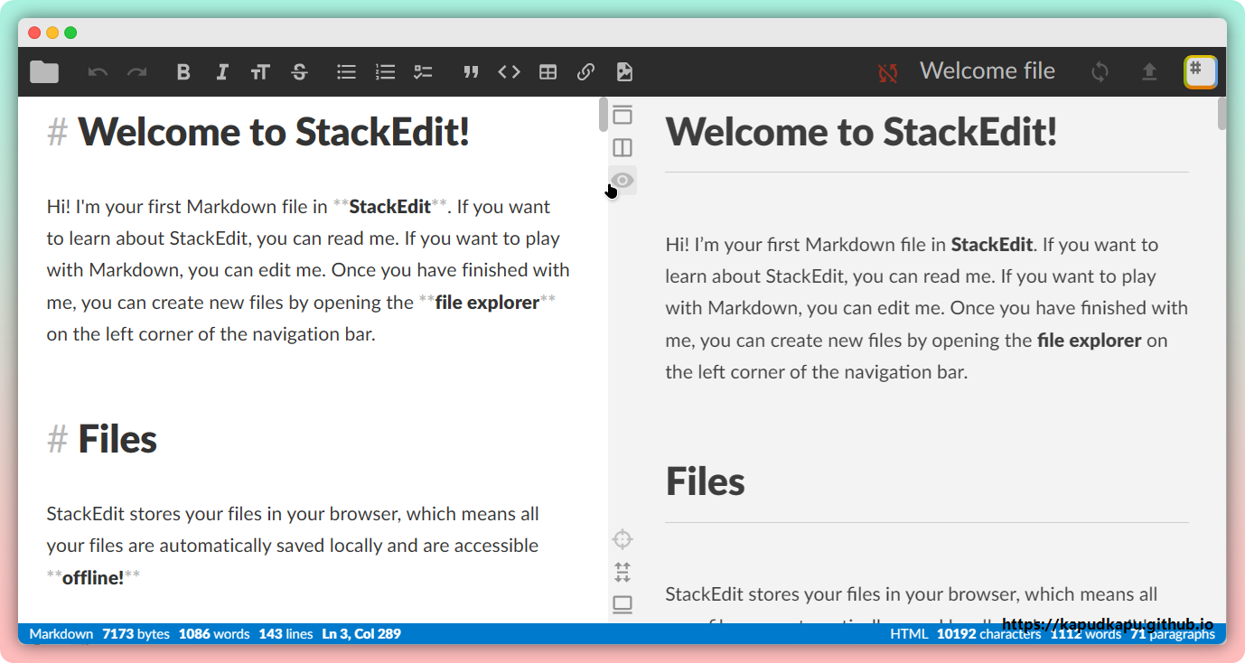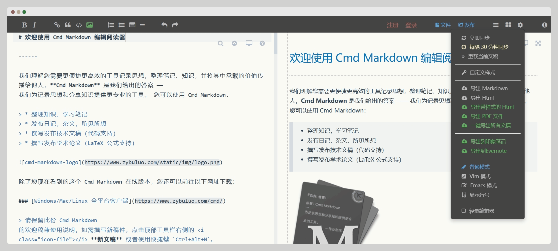Cmd Markdown 编辑阅读器,支持实时同步预览,区分写作和阅读模式,支持在线存储,分享文稿网址。