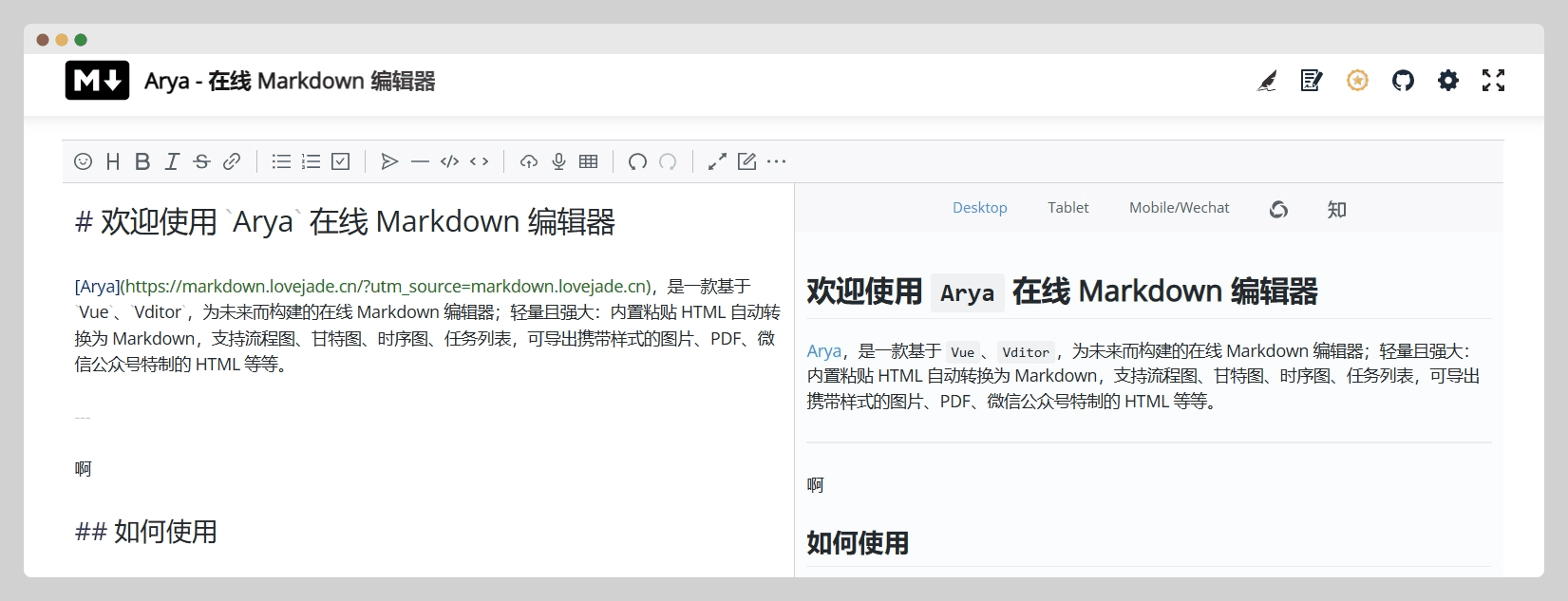Arya,是一款基于 Vue、Vditor,为未来而构建的在线 Markdown 编辑器;轻量且强大:内置粘贴 HTML自动转换为Markdown,支持流程图、甘特图、时序图、任务列表,可导出携带样式的图片、PDF、微信公众号特制的 HTML 等等。