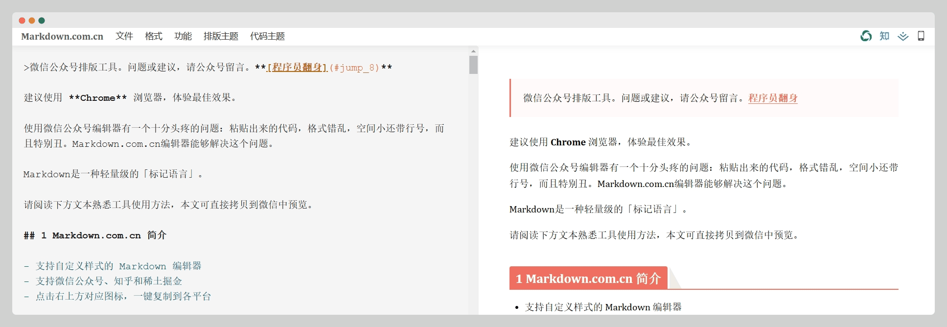 支持md文件导入导出,支持切换主题样式,支持切换代码主题,支持内容样式复制到微信公众号、掘金、知乎。