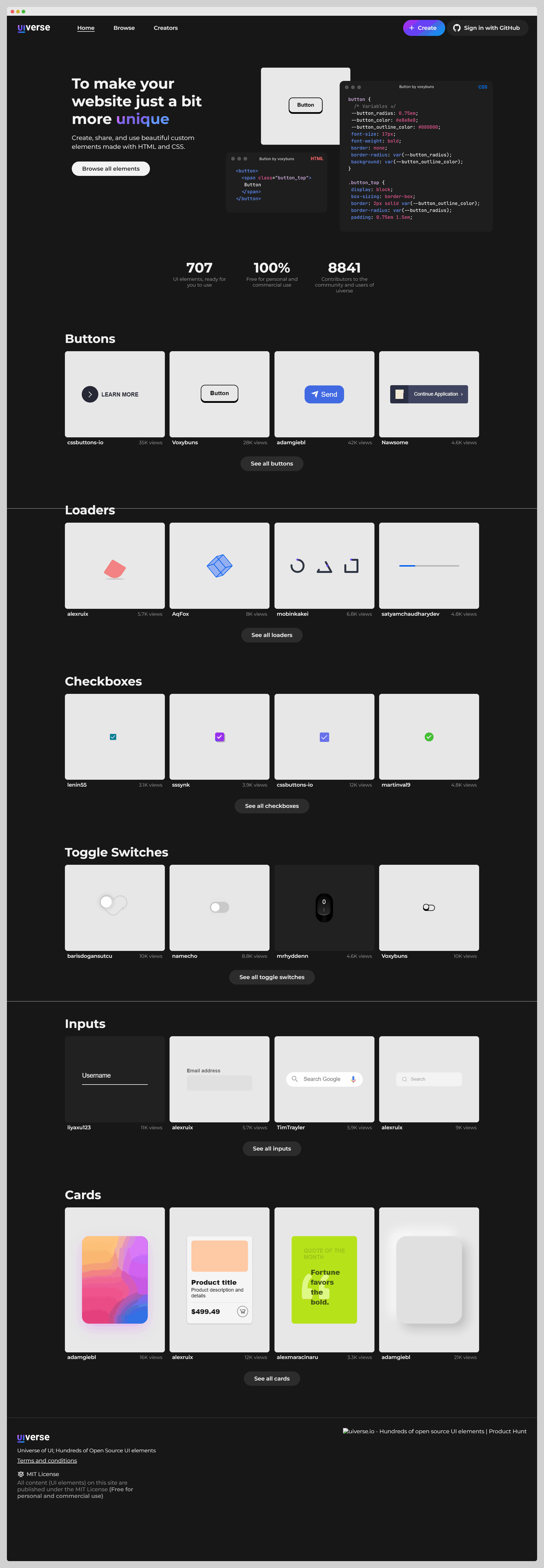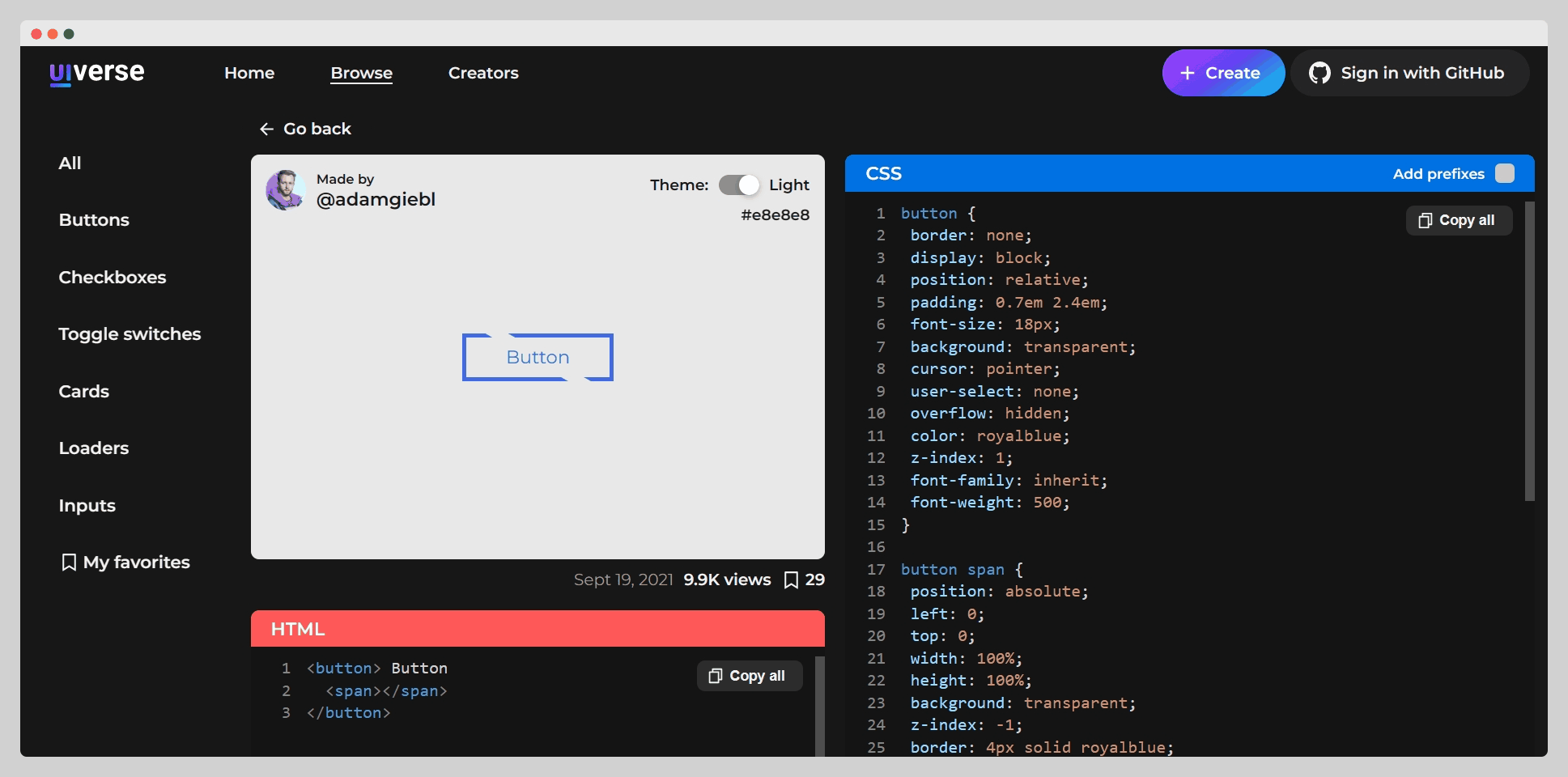 这是一个html元素设计网站,里面包含了按钮、复选框、加载动画、卡片、开关按钮、输入框等元素的各种各样漂亮的样式,点击进去还可以看到对应样式的详细的html、css、js代码,可以直接在项目引入,免费使用。
