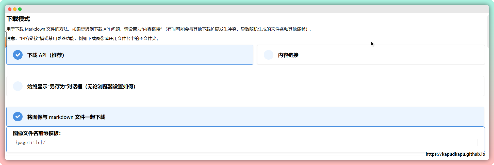 设置页面不需要设置什么,只有一点按需要注意,设置上【将图片与markdown文件一同下载】和图片样式板块的【纯markdown】选项选择上的话,下载的时候会下载图片,图片路径也会使用相对路径。这样整理比笔记的时候统一放置图片文件,统一修改下图片相对路径,图片就不会存在失效的情况。
