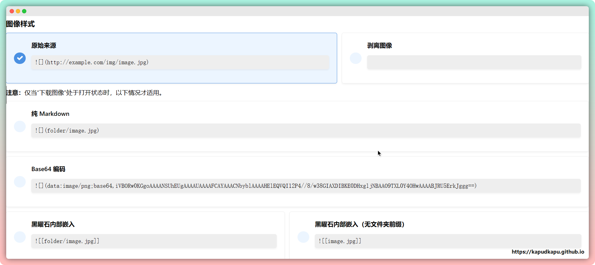 不设置这两个的话转换的markdown语言里面的图片使用的是图片的原始完整url路径,如果图片链接不支持外站引用的话就显示不了。