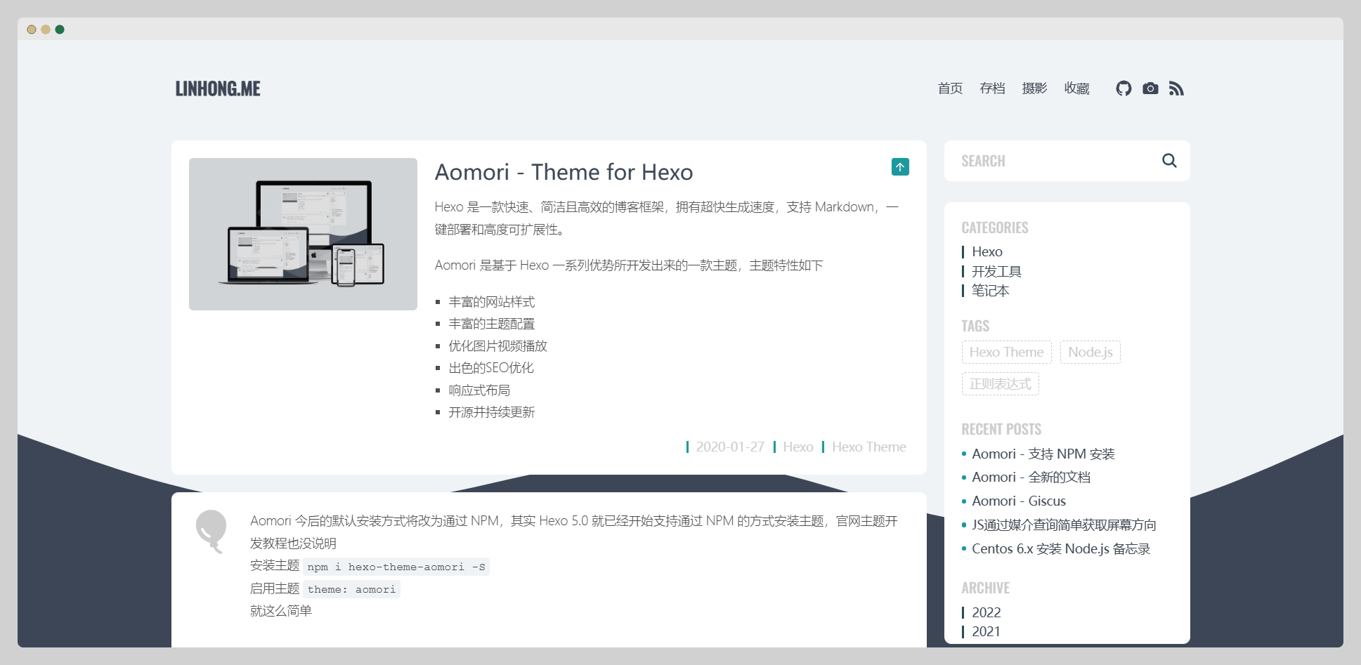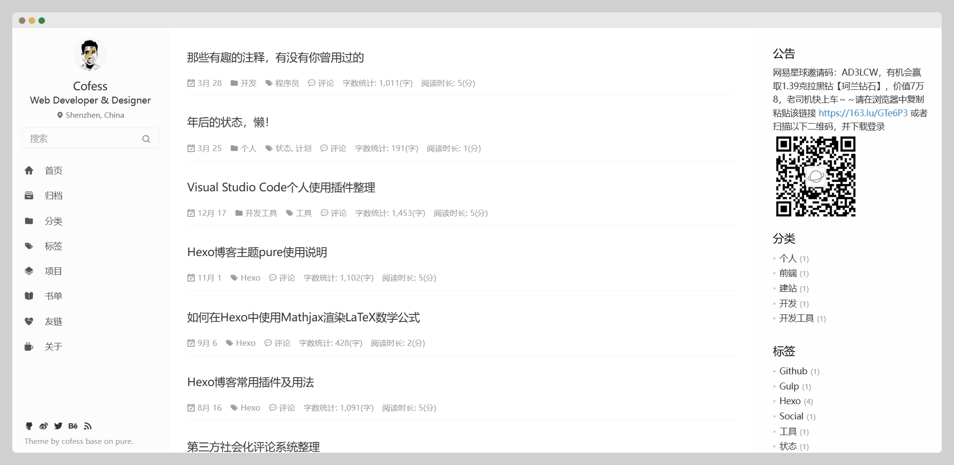 一款Material Design风格的Hexo主题,演示站及作者的站点,作者还做了无比详实的配置文档。