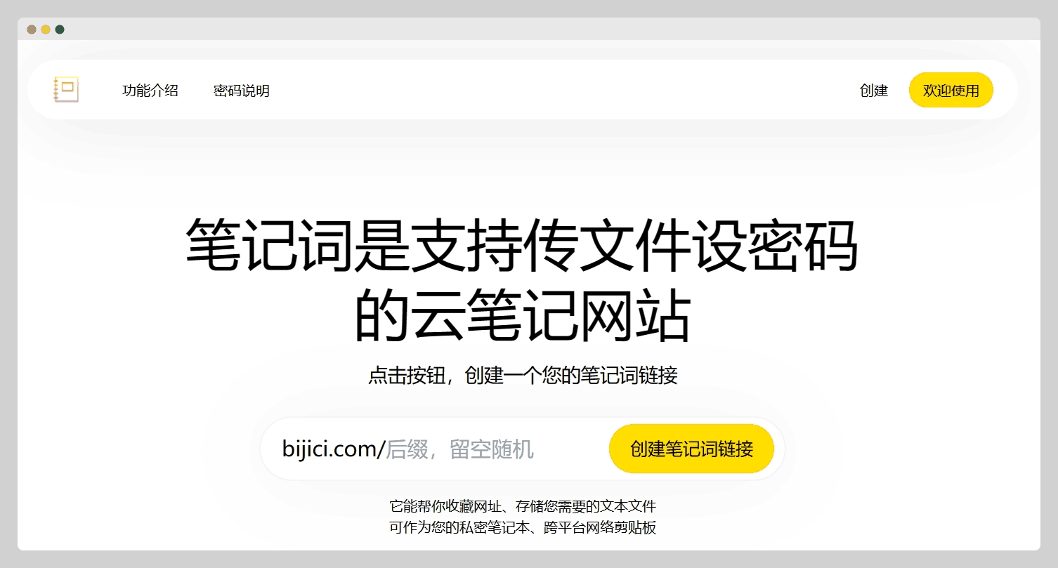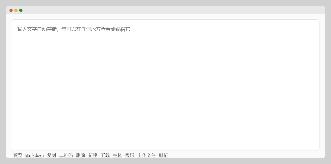 相当于一个在线的文本编辑器,内容自动保存。网址好记住,访问时会自动在域名后面生成一个字符串拼接成一个新的地址,也可以自己随意填写字符串,网址后面拼接的字段相当于文件名了。访问无密码,所有内容所有人可见可编辑。分享时只需提供你的url地址即可。