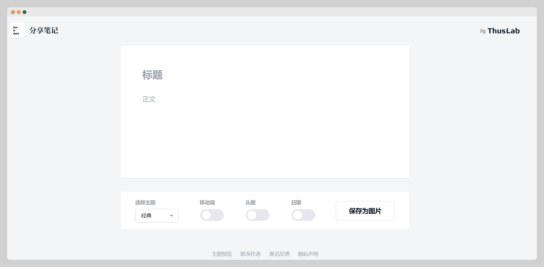 这是一个将文本内容生成图片分享的网站,支持选择主题,是否显示顶部图片,是否显示日期,以及是否启用异动端比例的样式。适合发朋友圈或者微博等动态。
