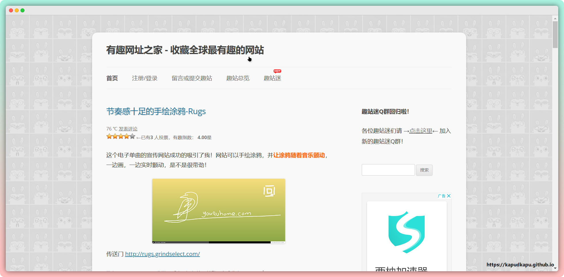 分享有趣的国内外网站&应用新奇的html5网站。和奇趣网站收藏家一样的初衷,这个可能创建的更早,一直在分享,挺稳定的。