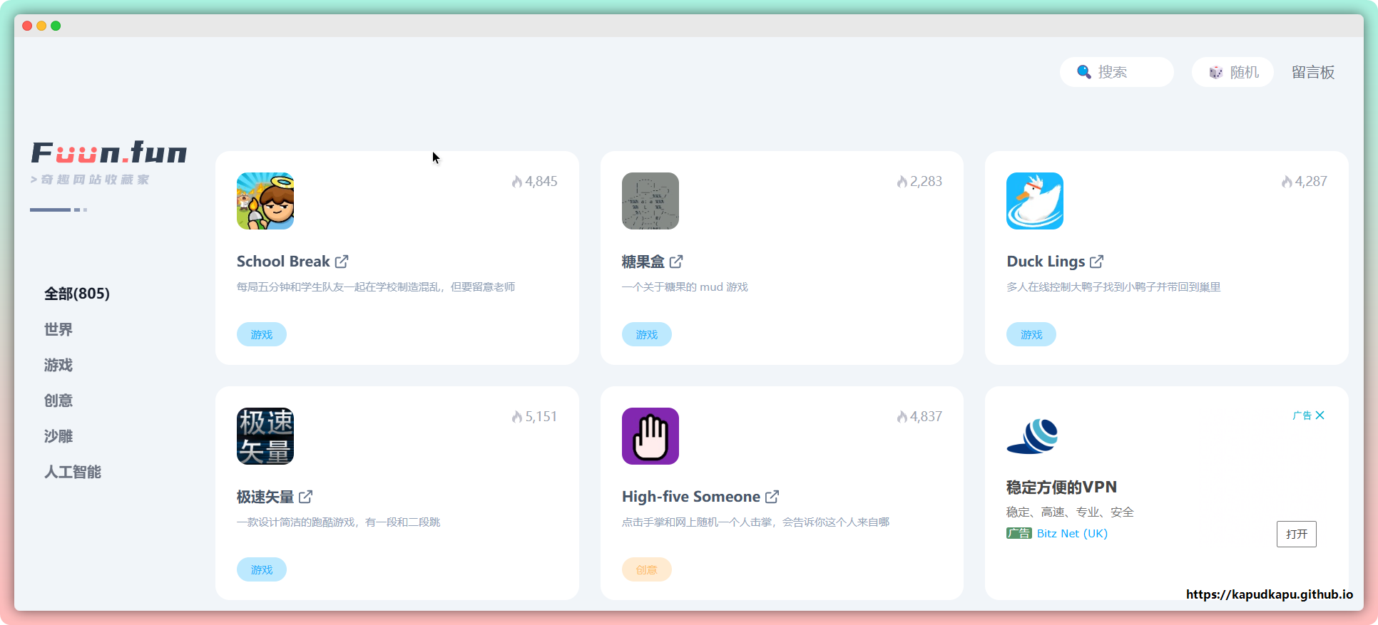 互联网上有不计其数的网站,或有趣、或沙雕、或奇奇怪怪、或。。。这些有趣的网站,因为太小众,不会被搜索引擎收录,因此几乎不会被人所知。为了让这些有趣的网站给更多的人带来快乐,作者创建了 FUUN.FUN。