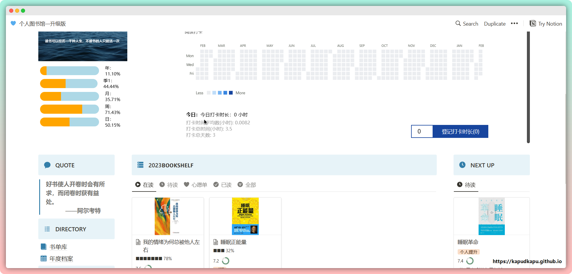 Notion个人图书馆模板。时间进度条以及每日阅读时长打卡,今年的全部书籍(以“在读”、“待读”、“心愿单”、“已读”展示不同视图),馆内导航—书单库,年度档案,年度、月度阅读进度。喜欢的可以复制到自己的nition内。