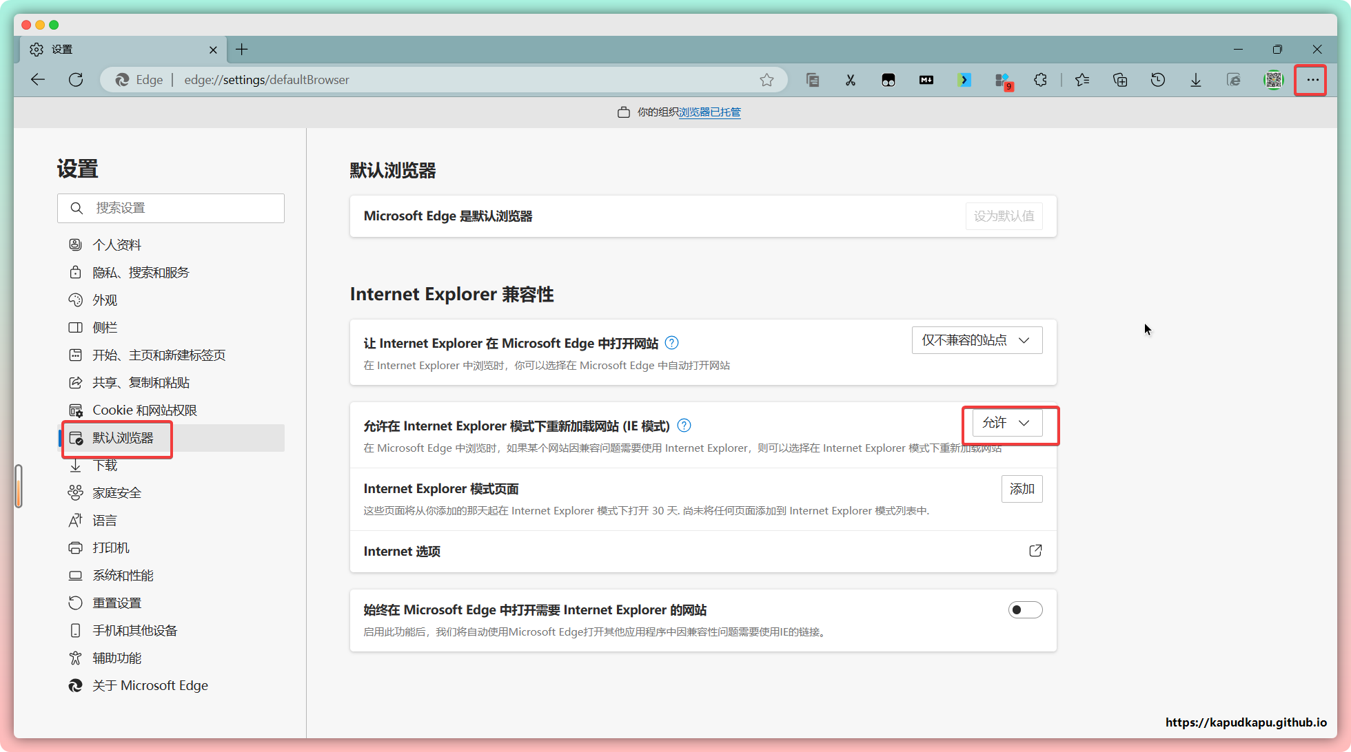 重启后,可以看到Edge浏览器的IE模式已经开启了,如下图。